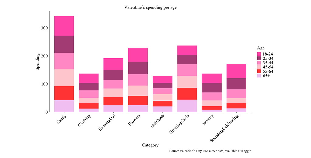 Love is in the air!!! El 14 de febrero es conocido por ser una fecha enla que abundan corazones, flores, chocolates y cupidos por todas partes. Para algunos es la oportunidad de agradecer y celebrar la precencia de una pareja o amigo especial en nuestras vidas, pero para otros significa consumismo. Es una gran fecha para ventas de productos como chocolates, flores, tarjetas de felicitación, cenas en restaurantes y grandes osos de peluche. Pero ¿en qué se gasta más? ¿Hay diferencia entre el tipo de cosas que se compra por grupo de edad?
