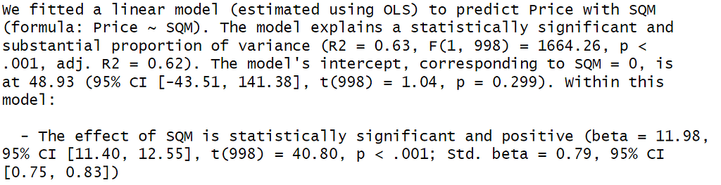 Esta interpretación puede hacerse con los conocimientos básicos acerca del modelo de regresión lineal, pero en R existe la colección de librerías “easystats” de la cual ya teníamos una entrada anterior que puedes revisar aquí. El reporte indica que el efecto de los metros cuadrados es positiva y significativa considerando un intervalo de confianza del 95%.