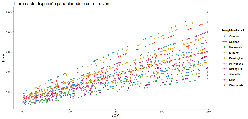 En esta ecuación, alfa es el intercepto (el valor que y toma cuando x=0) y beta es la pendiente, mientras que x puede tomar culaquier valor. Esta ecuación se calcula mediante un procedimiento matemático conocido como Mínimos Cuadrados Ordinario (MCO) o OLS (Ordinary Least Squares) por sus siglas en inglés. Usaremos el dataset Houses in London para hacer un ejemplo de regresión simple en R, en el que el precio será la variable dependiente, mientras que la variable independiente serán los metros de cada propiedad. Puedes ver el análisis de este dataset aquí. En ese análisis se determinó que existe una correlación entre el precio de venta y los metros cuadrados, por lo que se puede construir un modelo de regresión.